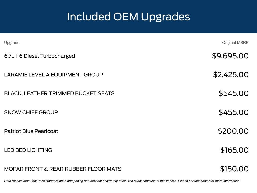 This Laramie trim level elevates your driving experience with a host of premium features, including the Laramie Level A Equipment Group, which adds thoughtful touches like power-folding mirrors, auto high-beam headlamp control, and a remote tailgate release. The Snow Chief Group further enhances the truck's off-road capabilities with features like clearance lamps and a transfer case skid plate shield.