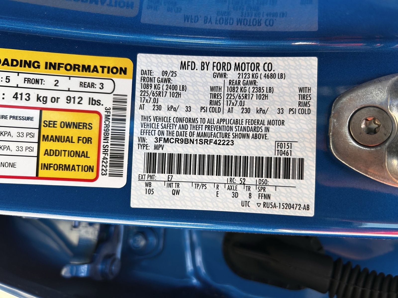 This 2025 Ford Bronco Sport Big Bend in Blue Metallic comes with the following features: 1.5L EcoBoost 8-Speed Automatic 4WD Convenience Package (Front Driver/Passenger Seat Back Map Pockets, Heated 8-Way Power Driver's Seat, LED Fog Lamps, Premium Wrapped Steering Wheel, and Universal Garage Door Opener (UGDO)), Equipment Group 200A, 4-Wheel Disc Brakes, 6 Speakers, ABS brakes, Air Conditioning, Alloy wheels, AM/FM radio: SiriusXM, AM/FM Stereo, Auto High-beam Headlights, Automatic temperature control, Brake assist, Cloth w/Easy-to-Clean Front Bucket Seats, Compass, Delay-off headlights, Driver door bin, Driver vanity mirror, Dual front impact airbags, Dual front side impact airbags, Electronic Stability Control, Emergency communication system: SYNC 4 911 Assist, Four wheel independent suspension, Front anti-roll bar, Front Bucket Seats, Front Center Armrest, Front reading lights, Fully automatic headlights, Heated door mirrors, Illuminated entry, Knee airbag, Low tire pressure warning, Occupant sensing airbag, Outside temperature display, Overhead airbag, Overhead console, Panic alarm, Passenger door bin, Passenger vanity mirror, Power door mirrors, Power steering, Power windows, Radio data system, Rear anti-roll bar, Rear Parking Sensors, Rear reading lights, Rear seat center armrest, Rear window defroster, Rear window wiper, Remote keyless entry, Security system, SiriusXM, Speed control, Speed-sensing steering, Speed-Sensitive Wipers, Split folding rear seat, Steering wheel mounted audio controls, SYNC 4 w/Enhanced Voice Recognition, Tachometer, Telescoping steering wheel, Tilt steering wheel, Traction control, Trip computer, Variably intermittent wipers, and Wheels: 17 Carbonized Gray-Painted Aluminum.