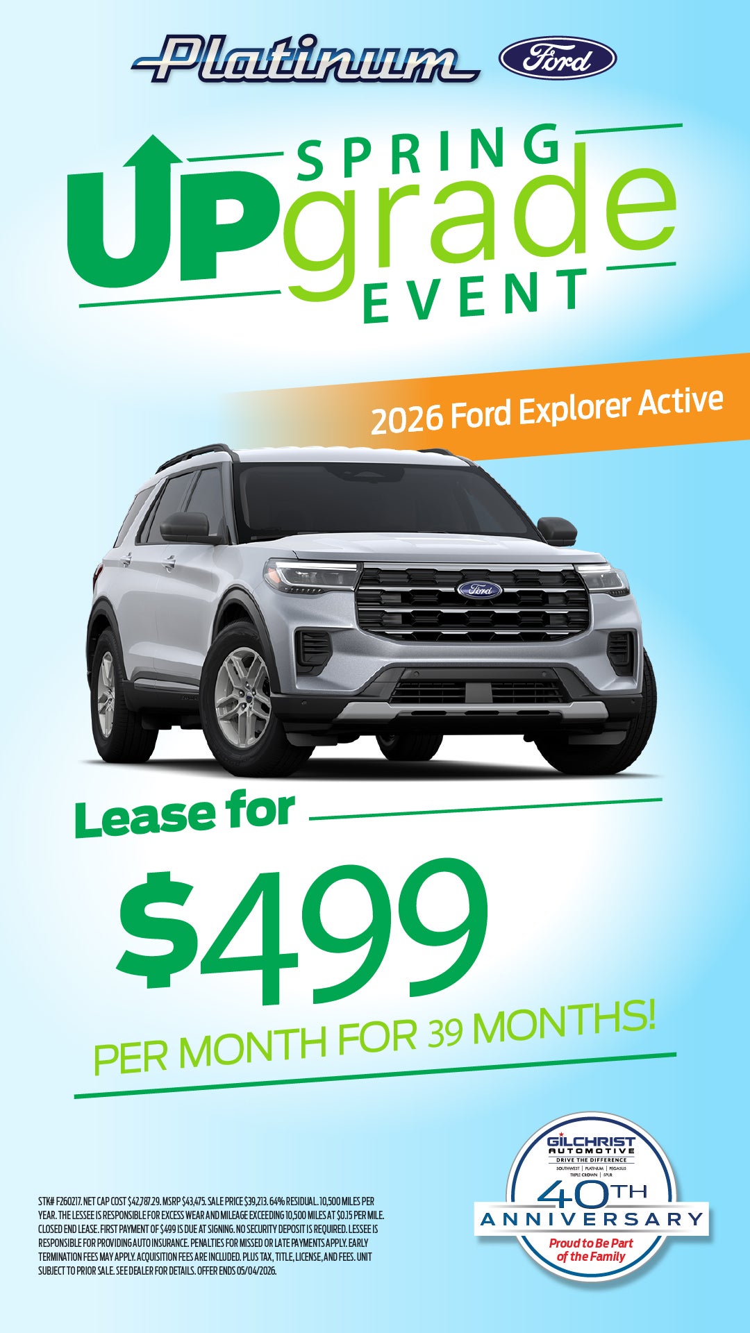 STK #F251861. NET CAP COST $31,225.45. MSRP $34,685. SALE PRICE $29,746. 52% RESIDUAL. 10,500 MILES PER YEAR. THE LESSEE IS RESPONSIBLE FOR EXCESS WEAR AND MILEAGE EXCEEDING 10,500 MILES AT $0.15 PER MILE. CLOSED END LEASE. FIRST PAYMENT OF $325 IS DUE AT SIGNING. NO SECURITY DEPOSIT IS REQUIRED. LESSEE IS RESPONSIBLE FOR PROVIDING AUTO INSURANCE. PENALTIES FOR MISSED OR LATE PAYMENTS APPLY. EARLY TERMINATION FEES MAY APPLY. ACQUISITION FEES ARE INCLUDED. PLUS TAX, TITLE, LICENSE, AND FEES. UNIT SUBJECT TO PRIOR SALE. SEE DEALER FOR DETAILS. OFFER ENDS 05/04/2026.