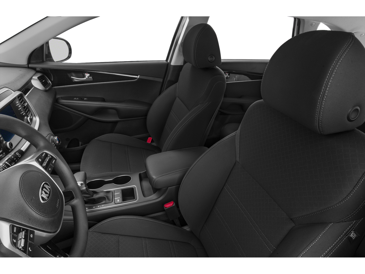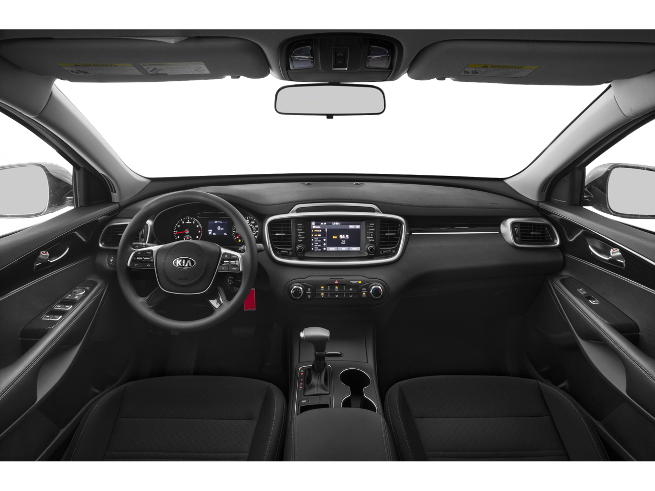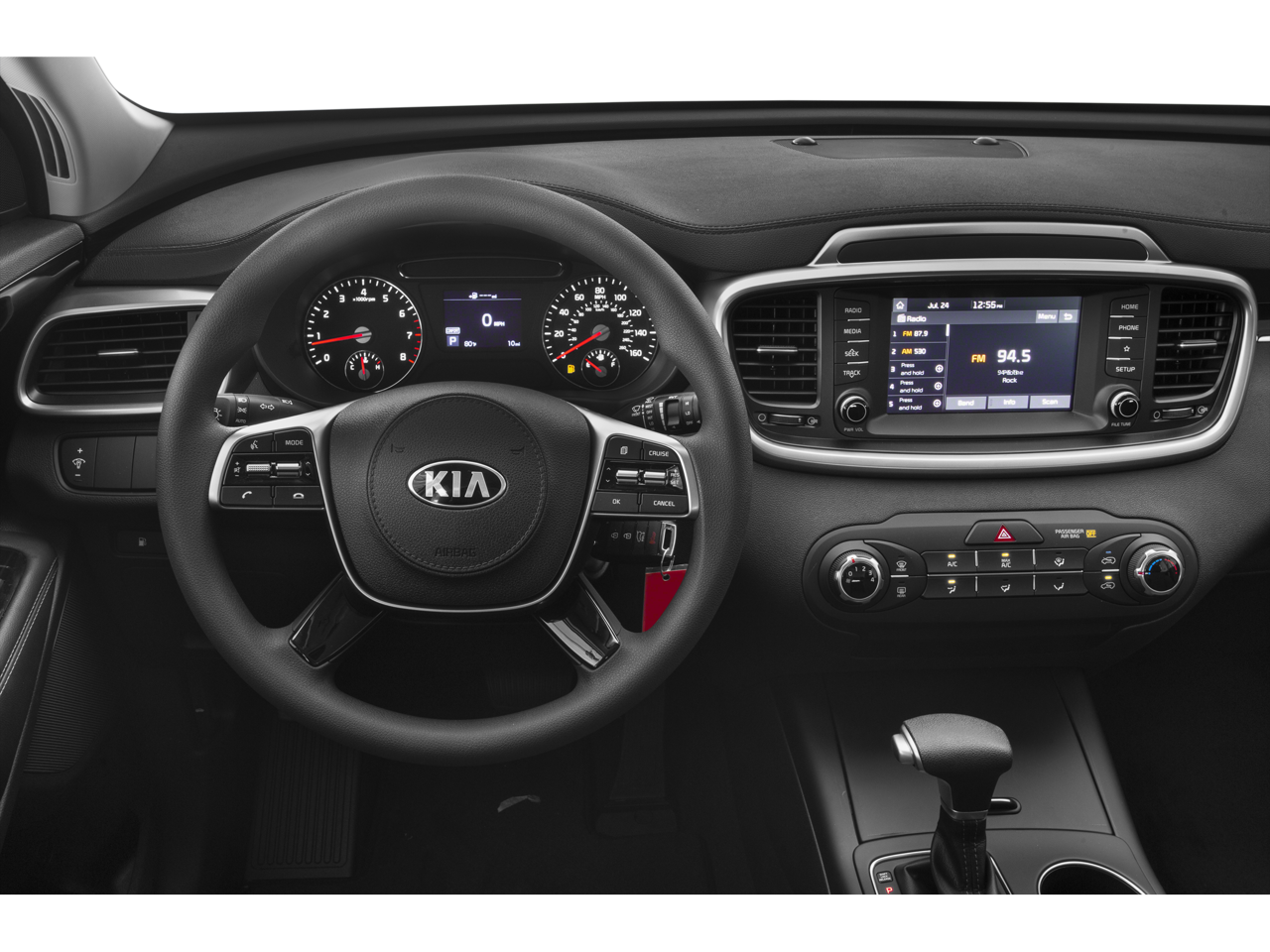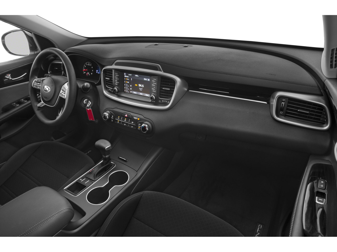 This 2019 Kia Sorento LX in Ebony Black comes with the following features: V6 8-Speed Automatic AWD AWD, 17 x 7.0 Alloy Wheels, 3.51 Axle Ratio, 3rd row seats: split-bench, 4-Wheel Disc Brakes, 6 Speakers, ABS brakes, Air Conditioning, Alloy wheels, AM/FM radio, Apple CarPlay & Android Auto, Automatic temperature control, Brake assist, Bumpers: body-color, Carpeted Floor Mats (7-Passenger), Delay-off headlights, Driver door bin, Driver vanity mirror, Dual front impact airbags, Dual front side impact airbags, Electronic Stability Control, Exterior Parking Camera Rear, Four wheel independent suspension, Front anti-roll bar, Front Bucket Seats, Front Center Armrest, Front dual zone A/C, Front reading lights, Fully automatic headlights, Heated door mirrors, Illuminated entry, Low tire pressure warning, Occupant sensing airbag, Outside temperature display, Overhead airbag, Overhead console, Panic alarm, Passenger door bin, Passenger vanity mirror, Power door mirrors, Power driver seat, Power steering, Power windows, Radio data system, Radio: UVO Play w/AM/FM/MP3, Rear anti-roll bar, Rear seat center armrest, Rear window defroster, Rear window wiper, Remote keyless entry, Security system, Speed control, Speed-sensing steering, Split folding rear seat, Spoiler, Steering wheel mounted audio controls, Tachometer, Telescoping steering wheel, Tilt steering wheel, Traction control, Trip computer, Turn signal indicator mirrors, Variably intermittent wipers, and YES Essentials Cloth Seat Trim.