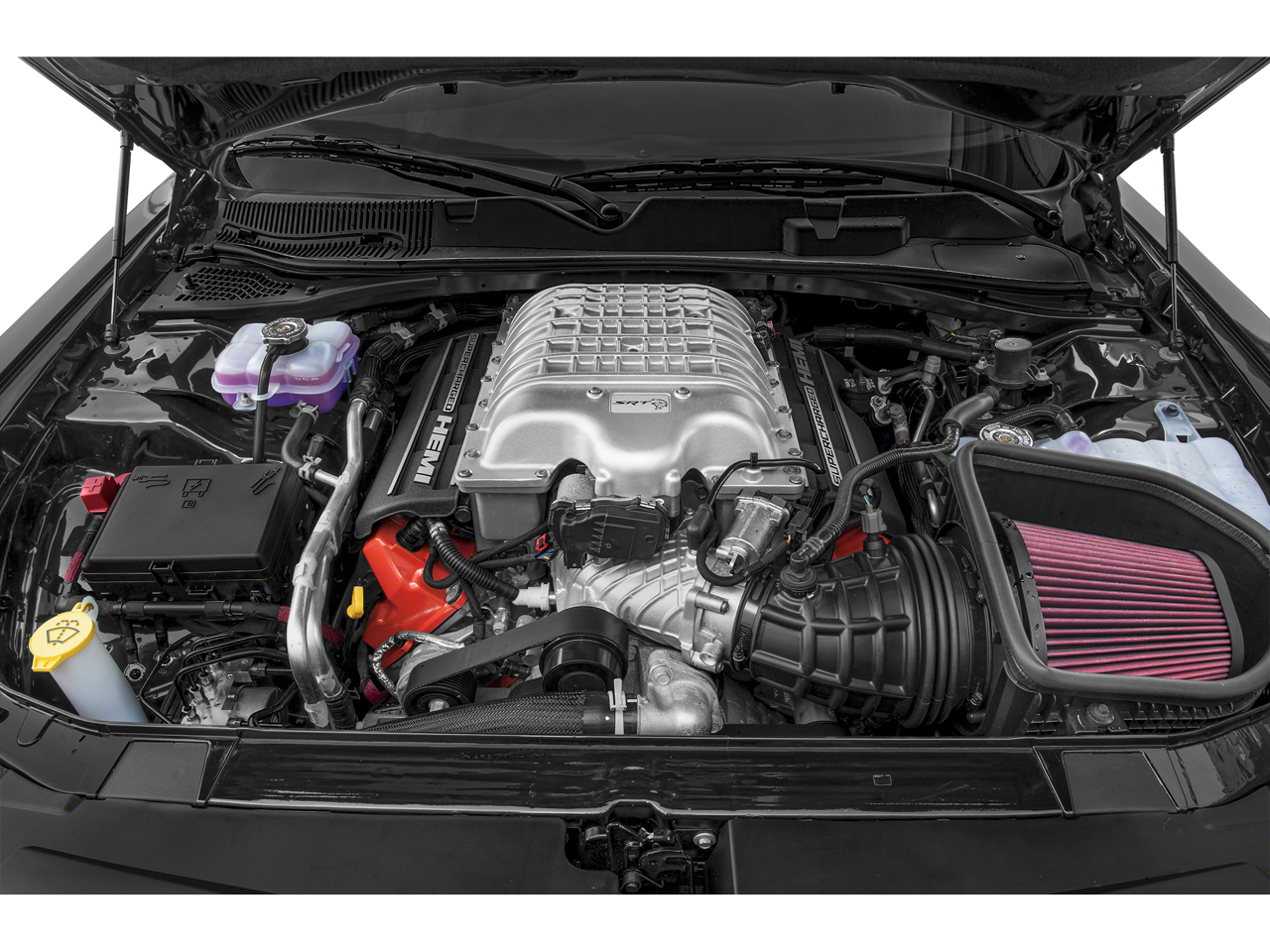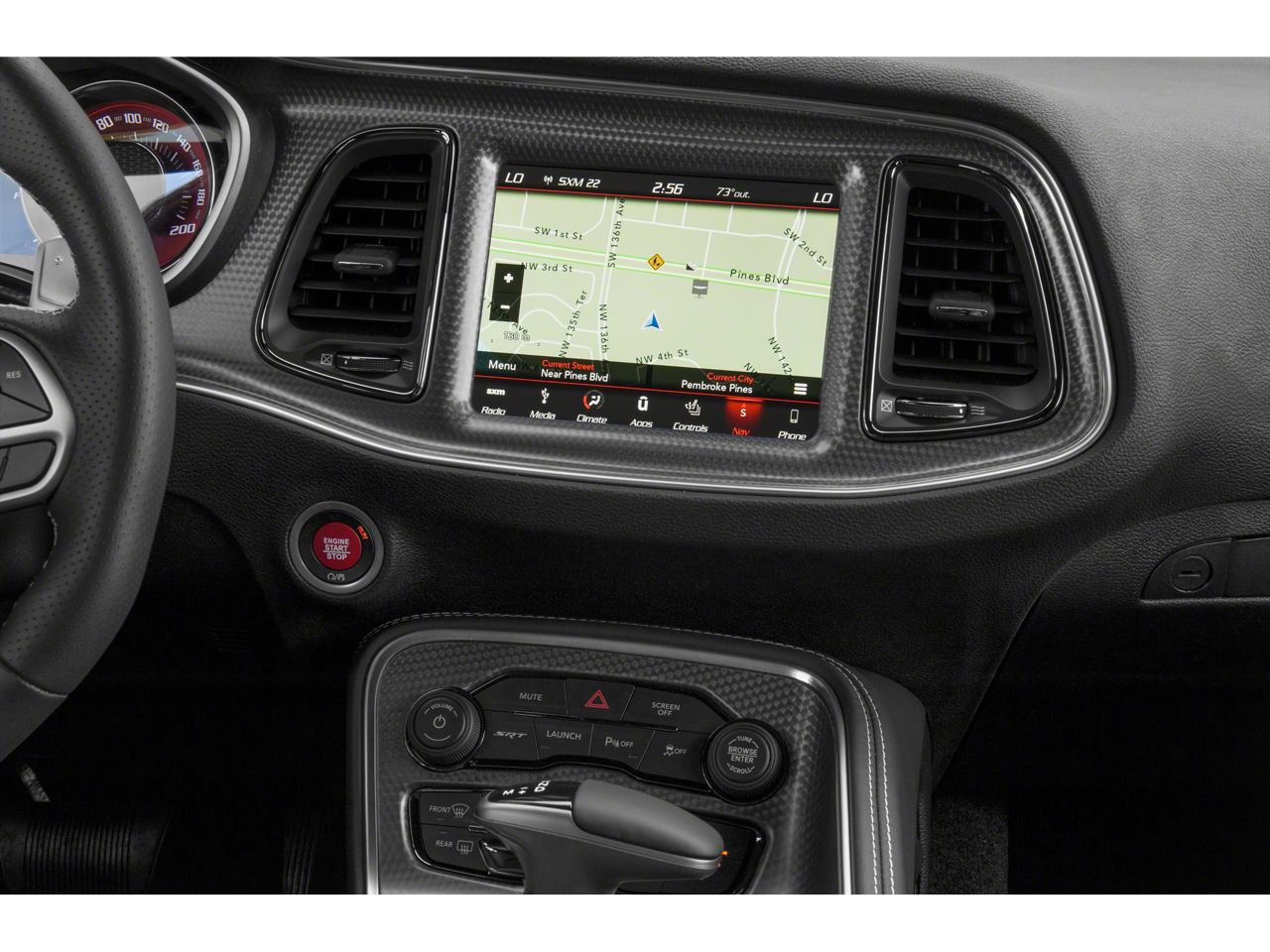 Step inside the cabin, and you'll be enveloped in a world of premium features. The Alcantara/Laguna Seats with the Hellcat logo, the Wildwheel Alcantara Steering Wheel, and the premium-stitched dash panel create an atmosphere of refined performance. The 8.4-inch Uconnect 4C touchscreen display, Apple CarPlay, and Android Auto integration ensure you stay connected and entertained on every journey.