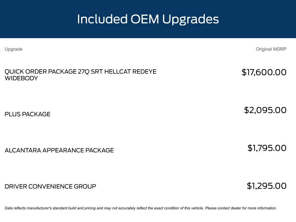 Prepare to be captivated by its unparalleled performance features: - Quick Order Package 27Q SRT Hellcat Redeye Widebody - Alcantara Appearance Package - Driver Convenience Group - Plus Package. These meticulously crafted enhancements elevate the Challenger's capabilities, ensuring an exhilarating driving experience like no other.