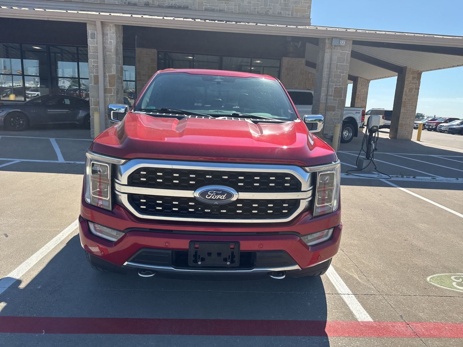 This 2023 Ford F-150 Platinum in Rapid Red Metallic Tinted Clearcoat comes with the following features: 3.5L PowerBoost Full-Hybrid V6 10-Speed Automatic 4WD Bed Utility Package (BoxLink, LED Box Lighting, Power Tailgate, and Tailgate Step w/Tailgate Work Surface), Equipment Group 701A High (360 Degree Camera, Pro Trailer Backup Assist & Pro Trailer Hitch Assist, and Radio: B&O Unleashed Sound System by Bang & Olufsen), Ford BlueCruise 1.0 (Active Park Assist 2.0), Max Trailer Tow Package (Class IV Trailer Hitch Receiver, Extended Range 36 Gallon Fuel Tank, and Integrated Trailer Brake Controller), F-150 Platinum, Ford Blue Advantage: Blue Certified Certified, 4D SuperCrew, 3.5L PowerBoost Full-Hybrid V6, 10-Speed Automatic, 4WD, Rapid Red Metallic Tinted Clearcoat, Black Leather, 18 Speakers, 20 Polished Aluminum Wheels, 3.31 Axle Ratio, 4-Wheel Disc Brakes, ABS brakes, Active Park Assist 2.0 Removal, Adjustable pedals, Air Conditioning, Alloy wheels, AM/FM radio: SiriusXM with 360L, Auto High-beam Headlights, Auto Start-Stop Removal (DISC), Auto tilt-away steering wheel, Auto-dimming door mirrors, Auto-dimming Rear-View mirror, Automatic temperature control, Brake assist, Bumpers: body-color, Compass, Delay-off headlights, Driver door bin, Driver vanity mirror, Dual front impact airbags, Dual front side impact airbags, Electronic Locking w/3.73 Axle Ratio, Electronic Stability Control, Emergency communication system: SYNC 4 911 Assist, Exterior Parking Camera Rear, Front anti-roll bar, Front Bucket Seats, Front Center Armrest, Front dual zone A/C, Front fog lights, Front reading lights, Front wheel independent suspension, Fully automatic headlights, Garage door transmitter, Heated door mirrors, Heated front seats, Heated rear seats, Heated steering wheel, Illuminated entry, Inclination/Intrusion Sensor Removal, Interior Work Surface, LED Sideview Mirror Spotlights, Low tire pressure warning, Memory seat, Multicontour Seats w/Active Motion Removal, Occupant sensing airbag, Outside temperature display, Overhead airbag, Overhead console, Panic alarm, Passenger door bin, Passenger vanity mirror, Pedal memory, Power door mirrors, Power driver seat, Power passenger seat, Power steering, Power windows, Pro Power Onboard - 7.2KW, Radio data system, Radio: B&O Sound System by Bang & Olufsen, Rain sensing wipers, Rear reading lights, Rear seat center armrest, Rear step bumper, Rear window defroster, Remote keyless entry, Security system, Speed control, Speed-sensing steering, Split folding rear seat, Steering Wheel Heat Removal (DISC), Steering wheel memory, Steering wheel mounted audio controls, SYNC 4 w/Enhanced Voice Recognition, Tachometer, Telescoping steering wheel, Tilt steering wheel, Traction control, Trip computer, Turn signal indicator mirrors, Twin Panel Moonroof, Unique Multi-Contour Leather Bucket Seats, Variably intermittent wipers, Ventilated front seats, and Voltmeter. Certified.