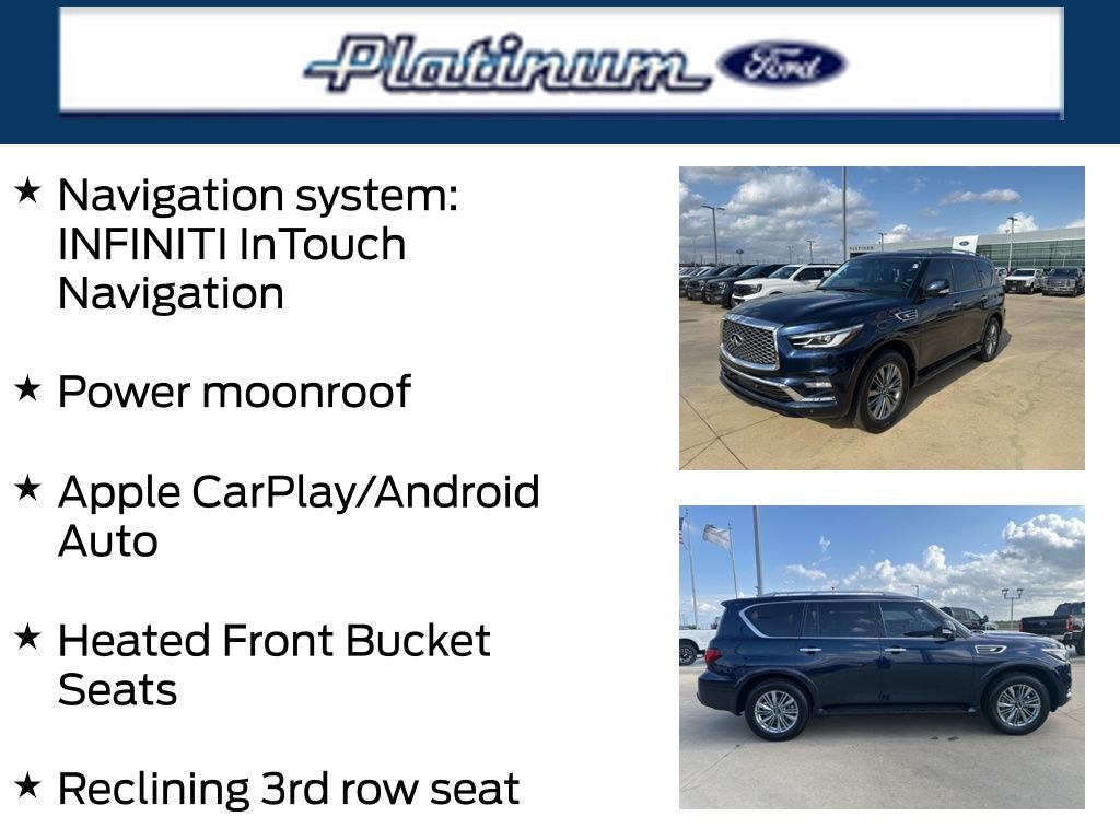 Beneath the sleek exterior, a powerful 5.6L V8 engine delivers an exhilarating 7-speed automatic driving experience, offering a remarkable balance of performance and efficiency with 14 city/20 highway MPG. The QX80's commanding presence is further enhanced by its striking Blue exterior, commanding attention wherever you go.